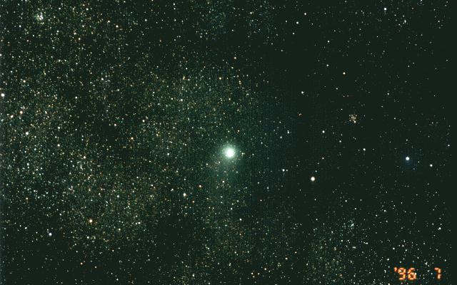 object: C/1995 O1 Hale-Bopp date of obs: Jul 12 1996 15:15 UT 10min exp. place of obs: Takayu ski resort, Fukushima city Japan camera: Canon EOS55, Canon 400mm F2.8(2.8)lens film: Fujicolor Super G400 ACE equatorial: GOTO MARK-X observer: Kazuyoshi Namura remarks: